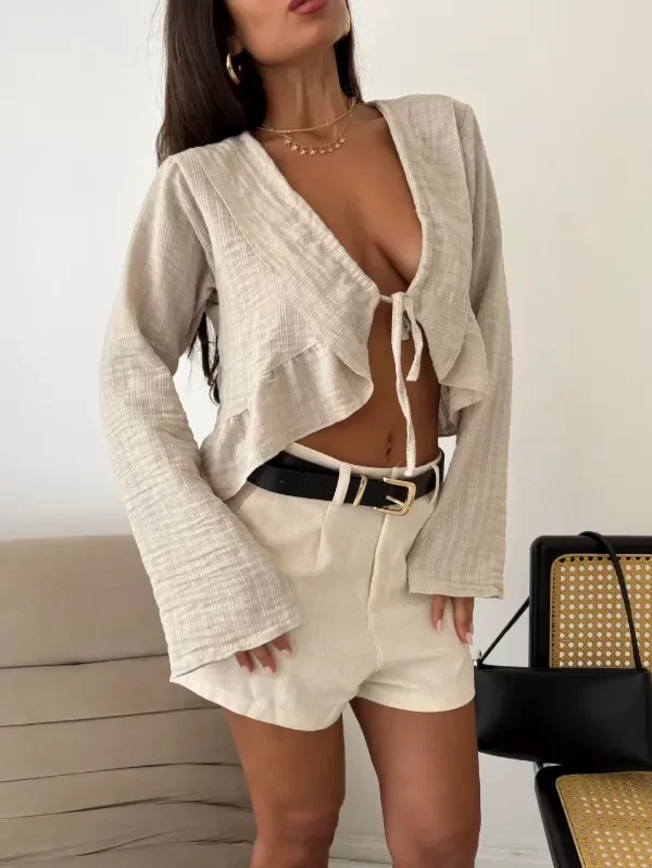 Blusa tipo cropped , confeccionada en tela liviana con textura. Diseño cruzado con escote en V y lazo frontal, mangas largas acampanadas que aportan un look femenino y relajado, ideal para combinar en outfits de día o de verano.