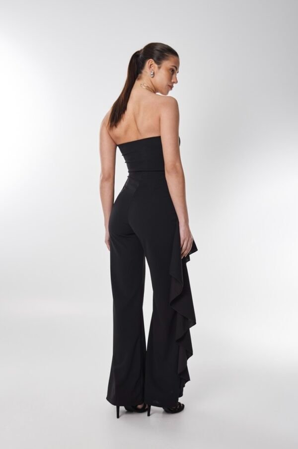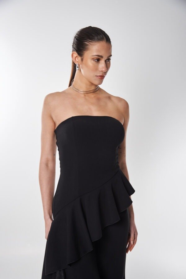 Mono strapless de crep elastizado con busto armado.Se destaca por un importante volado que nace en forma diagonal extendiendose a lo largo de toda la pierna.