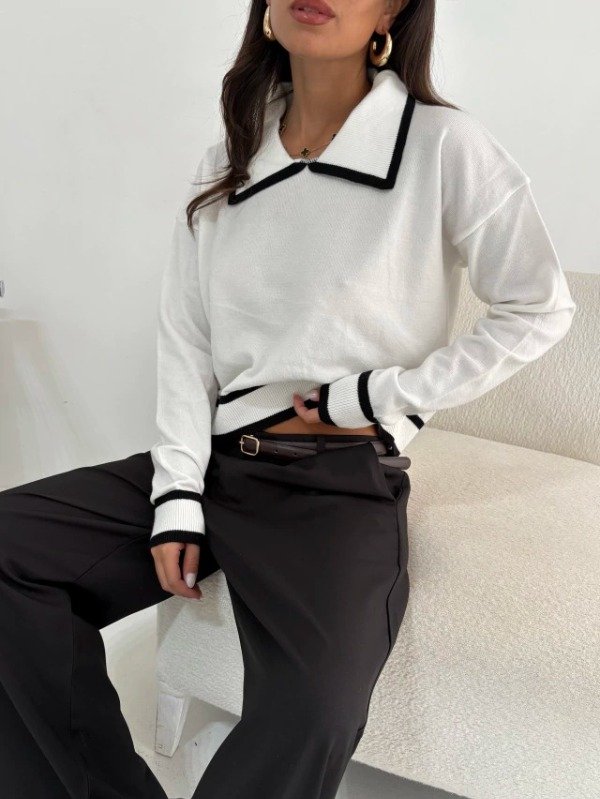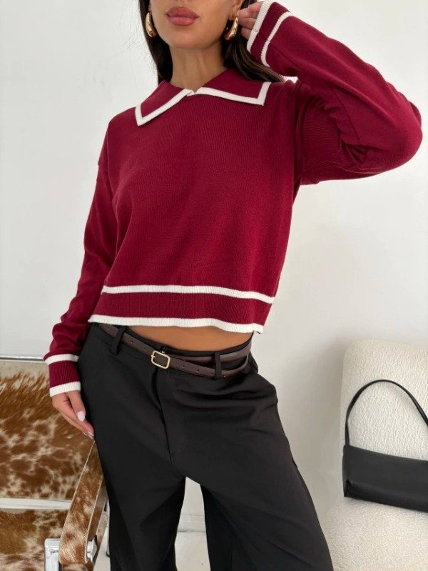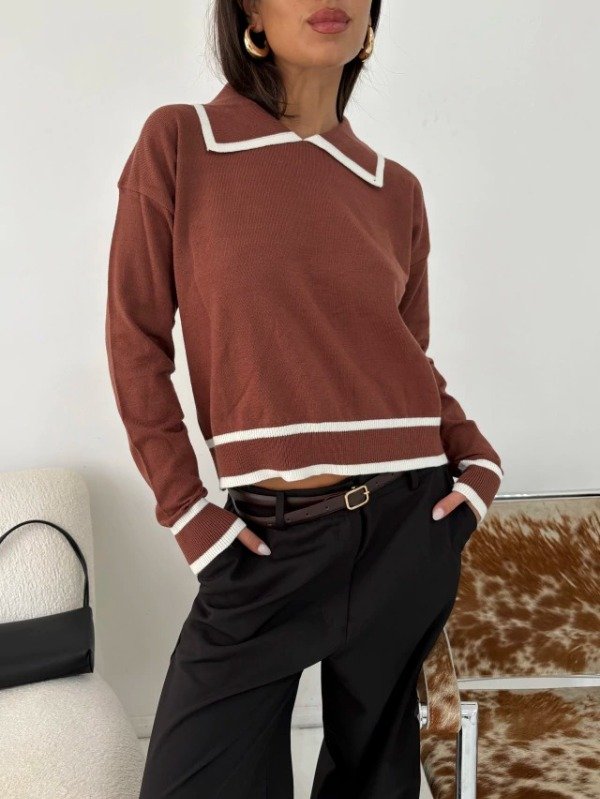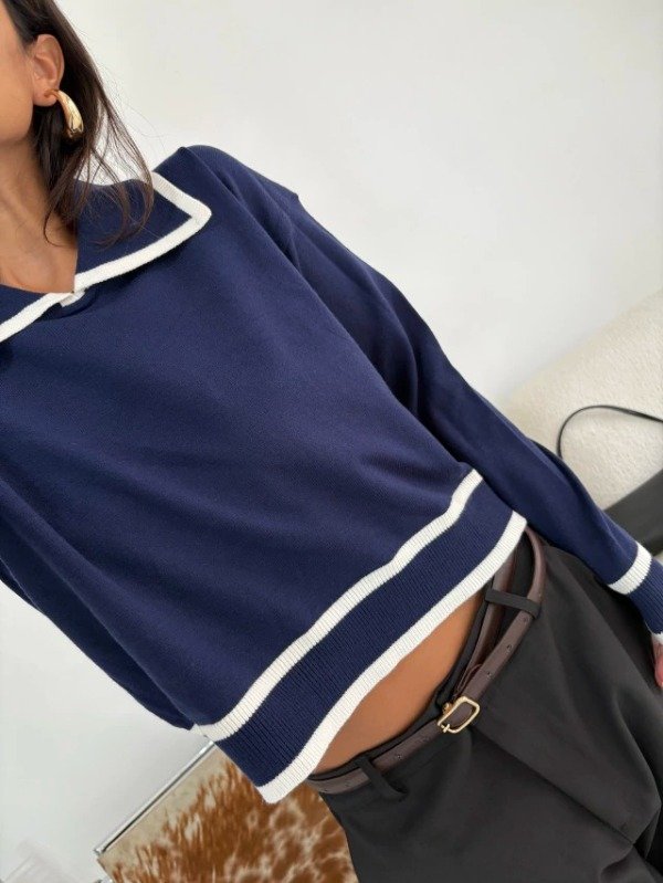 Suéter de bremer. Diseño con cuello polo y detalles en contraste. Tejido liviano, suave y confortable. Calce relajado. Largo a la cintura. Talle único equivale a un S/M