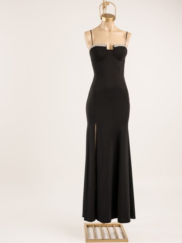 Vestido de crep elastizado con bretel regulable. Fit ceñido al cuerpo de excelente calce. La parte superior resalta con el busto armado e importante galon de strass.